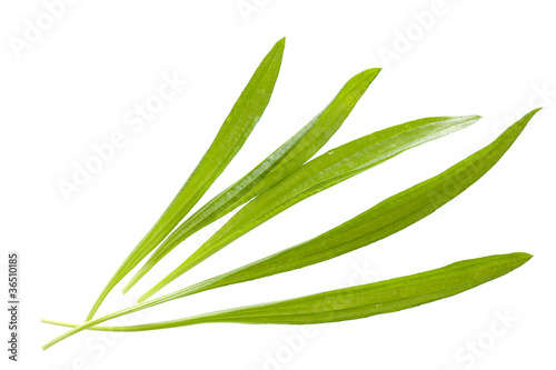 © unpict, Fototapeta premium Spitz-Wegerich (Plantago lanceolata) Blätter auf weiß diagonal