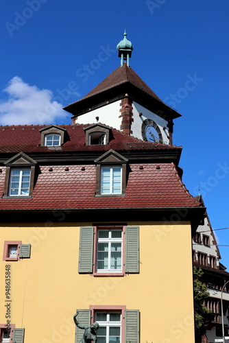 © christiane65, Fototapeta premium Spitze des Schwabentors in Freiburger hinter einem Gelben Altbau