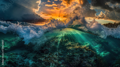 Obraz premium Splash of wave in sea, split technique