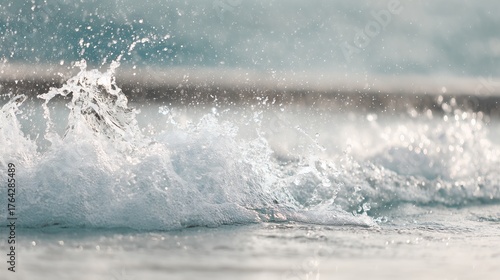 Naklejka premium Splashing Wave Cresting at the Shoreline, Capturing the Energy of the Ocean in a Detailed Nature Scene