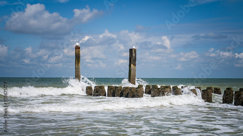 Fototapeta premium Splashing waves of the North Sea on the wooden breakwaters of the Dutch coast