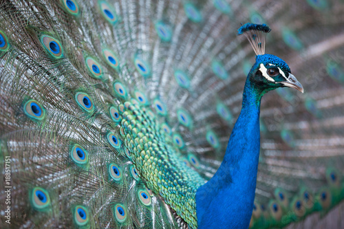 © lightpoet, Fototapeta premium Splendid peacock with feathers out (Pavo cristatus) (shallow DOF; color toned image)