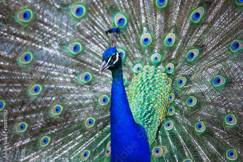 © lightpoet, Fototapeta premium Splendid peacock with feathers out (Pavo cristatus) (shallow DOF; color toned image)