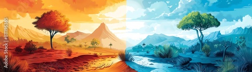 Naklejka premium Split landscape illustration showing a vivid contrast between a lush, vibrant...