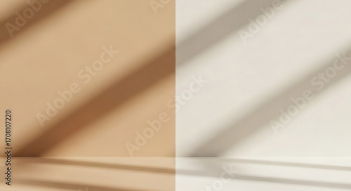 © Reza, Obraz premium Split screen background in beige and white with diagonal window shadows providing elegant copyspace for product presentation