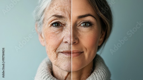 © Morng, Obraz premium Split view showing the aging process with one side of the face young and the other old, representing youth versus aging concept.