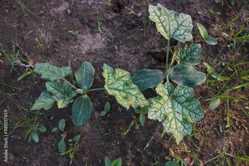 Fototapeta premium Sponge gourd plant. Its other names Luffa cylindrica, the sponge gourd, Egyptian cucumber or Vietnamese luffa. It is an annual species of vine cultivated for its fruit.