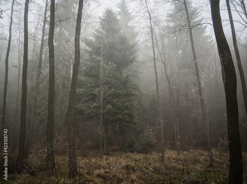 © Tadeas, Obraz premium Spooky and gloomy forest, fogging with amazing and dramatic atmosphere.