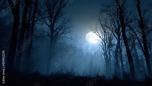 © Pman, Fototapeta premium Spooky atmospheric backdrop with silhouettes of trees and soft moonlight