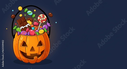 Fototapeta premium Spooky Candy Basket: A whimsical illustration depicts a cheerful jack-o'-lantern overflowing with a delightful assortment of candies and sweets, set against a dark, inviting background.