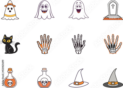 Fototapeta premium Spooky cartoon icons including smiling ghosts, skeleton hands, gravestone, black cat, and witch hats on white