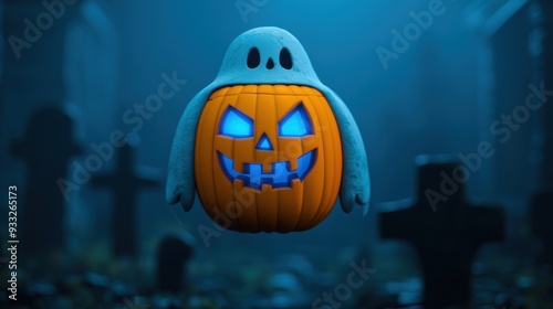© Arthur Constantine, Fototapeta premium Spooky Cartoon Pumpkin Ghost Floating Above Graveyard on Halloween Night with Ethereal Blue Light and Mist