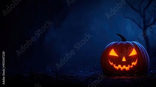 Naklejka premium Spooky Cartoon Pumpkin with Ghostly Aura in Haunted House at Eerie Night, Copy Space, Selective Focus,