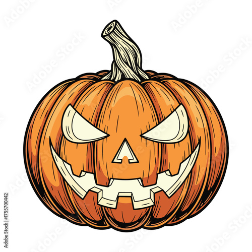 Fototapeta premium Spooky carved jack o lantern with glowing eyes and jagged teeth grinning menacingly.