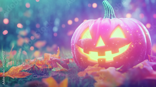 © LotusBlanc, Naklejka premium Spooky Carved Pumpkin Background, Jack-o'-Lantern with Lighting Candle for Halloween Celebration, Haloween Night Theme Background.