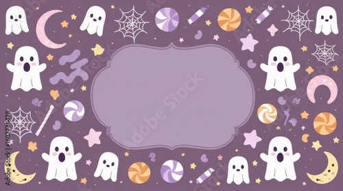 Fototapeta premium Spooky Celebration Elements: A vibrant, illustrative design is bursting with Halloween-themed elements such as ghosts, candy, stars, and webs, with an empty text box suitable for seasonal greetings.