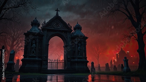 Fototapeta premium Spooky cemetery entrance gate is illuminated by an eerie red glow in the...