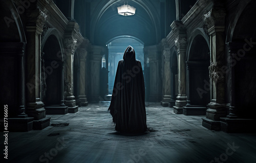 Naklejka premium Spooky dark hooded figure walks along an abandoned hall