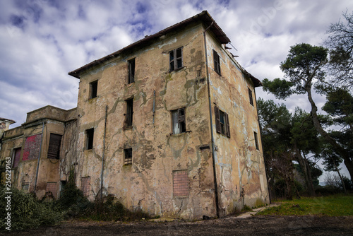 © evoks24, Fototapeta premium spooky deteriorated abandoned house on a cloudy dark day