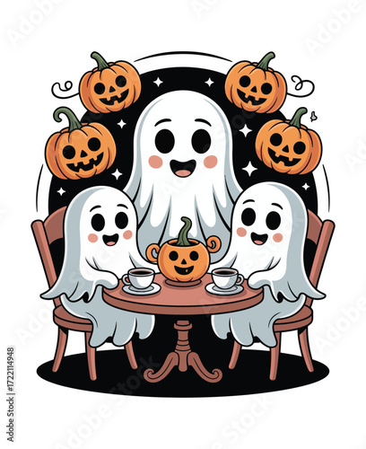 Fototapeta premium Spooky Dinner With Friendly Ghosts And Candy Pumpkin Feast