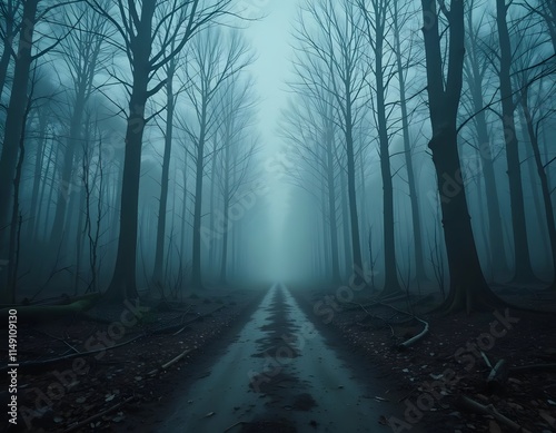 Naklejka premium Spooky Foggy Forest Path at Dusk