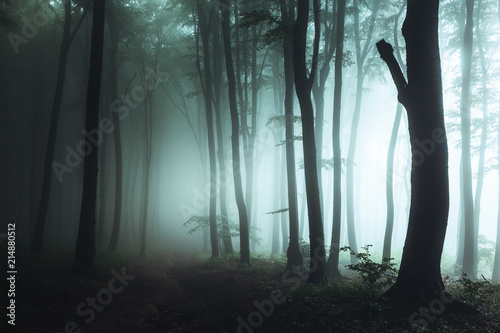 © bonciutoma, Fototapeta premium Spooky foggy forest trail. Dark trees in silhouettes with hard light coming from right. Horror landscape