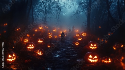 © Napasnan, Naklejka premium Spooky forest path lined with glowing jack-o'-lanterns, shadowy figures, and eerie fog.
