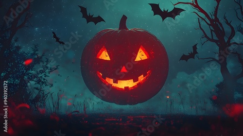 © Ben Kuang, Naklejka premium Spooky glowing Halloween pumpkin with bats in a misty, moonlit forest setting.