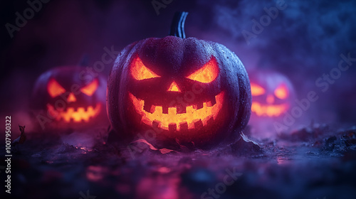 Naklejka premium Spooky glowing jack-o'-lanterns in misty night, Halloween scene