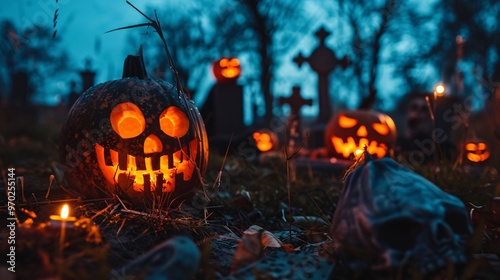 Fototapeta premium Spooky graveyard with glowing pumpkins