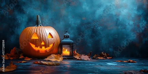 Fototapeta premium Spooky Halloween arrangement with glowing pumpkins, lanterns, and colorful fall leaves for an autumn celebration