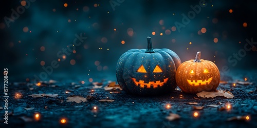 Fototapeta premium Spooky Halloween arrangement with glowing pumpkins, lanterns, and colorful fall leaves for an autumn celebration