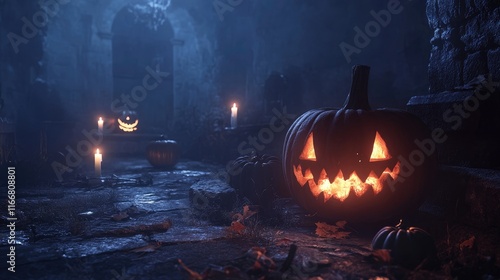 © Kultivad, Fototapeta premium Spooky Halloween background featuring carved pumpkins and flickering candles in an eerie dimly lit setting