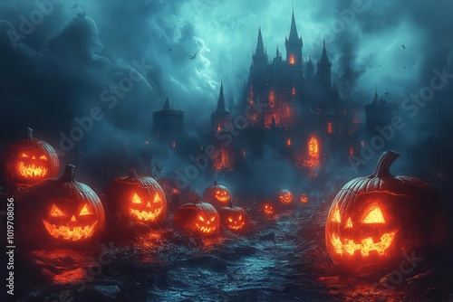 © Vesna, Naklejka premium spooky halloween background featuring eerie pumpkins adorning a dark haunted castle evoking a sense of mystery and fright in a gothic atmosphere