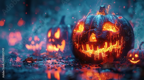 Fototapeta premium Spooky Halloween Banner: Glowing Fire Text and Sinister Pumpkins