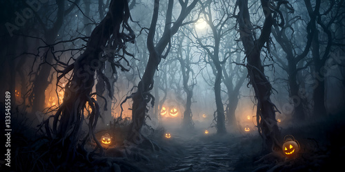 Obraz premium Spooky Halloween forest path with glowing jack-o'-lanterns