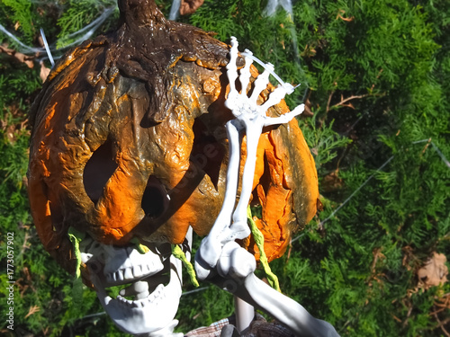Obraz premium Spooky Halloween garden decoration - funny pumpkin man