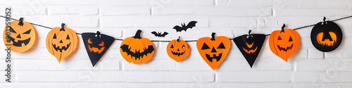 © EEKONG, Fototapeta premium Spooky Halloween Garlands and Banners on White Background with Copy Space for Seasonal Decorations and Party Celebrations