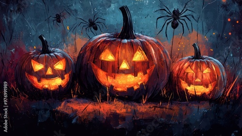 Fototapeta premium Spooky Halloween Jack O Lantern Pumpkins with Spiders and Webs