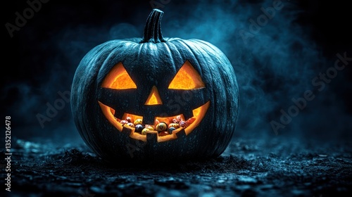 Naklejka premium Spooky Halloween Jack-o'-lantern with Treats in Dark Setting