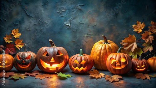 © AbdulKarim, Fototapeta premium Spooky Halloween Jack o Lanterns Glowing with Autumn Leaves on Dark Background