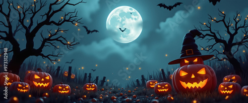 © 2April, Fototapeta premium Spooky Halloween Jack-O-Lanterns with Witch Hat and Full Moon and Dark Night