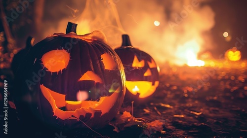 © Wuwu, Fototapeta premium Spooky Halloween Night Outdoor Background with Haunted House, Full Moon, Foggy Graveyard, Jack-o-Lanterns, and Eerie Atmosphere for Digital Art, Party Decor, or Horror Themes