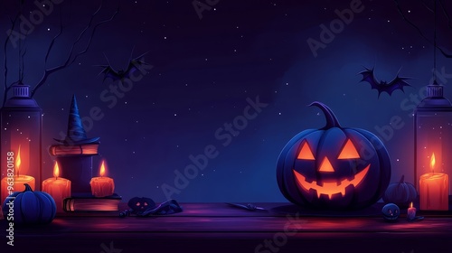 Fototapeta premium Spooky Halloween Night Scene with Pumkin Bats Candles and Witch's Hat