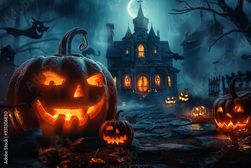Fototapeta premium Spooky Halloween Night With Carved Pumpkins And Haunted House Under Full Moon