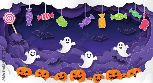 Naklejka premium Spooky Halloween night with flying ghosts hanging candies and carved pumpkins...