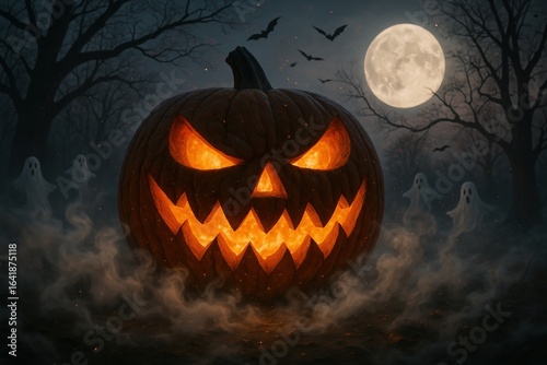 Fototapeta premium spooky halloween night with glowing jack-o'-lantern in foggy forest under full moonlit sky