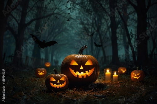 © MdAnisur, Fototapeta premium Spooky halloween night with glowing jack o lanterns and flying bats