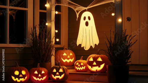 © simohamed, Obraz premium Spooky Halloween Night with Glowing Jack-O'-Lanterns and Hanging Ghost Decorations on Porch