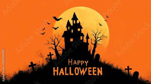 Naklejka premium Spooky Halloween Night with Haunted House and Full Moon Glow Against Orange...